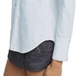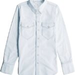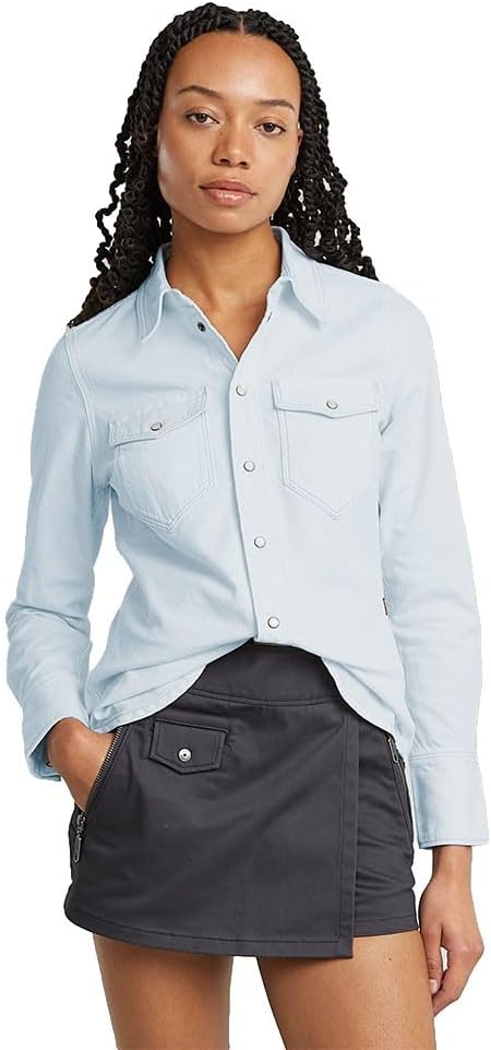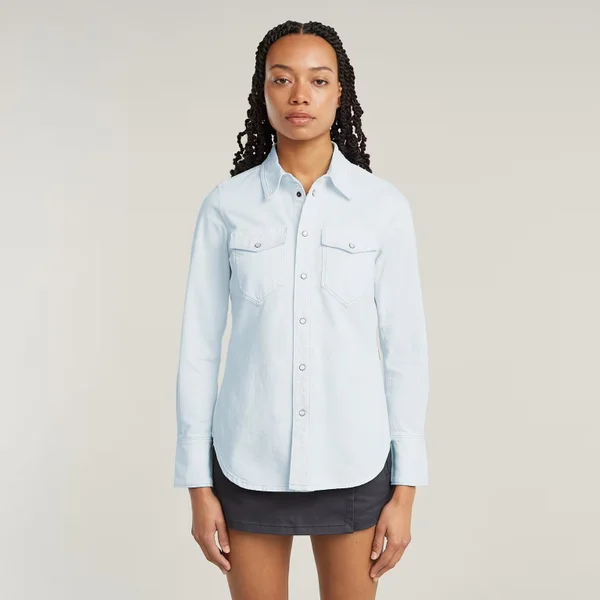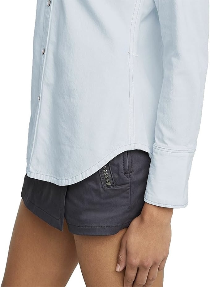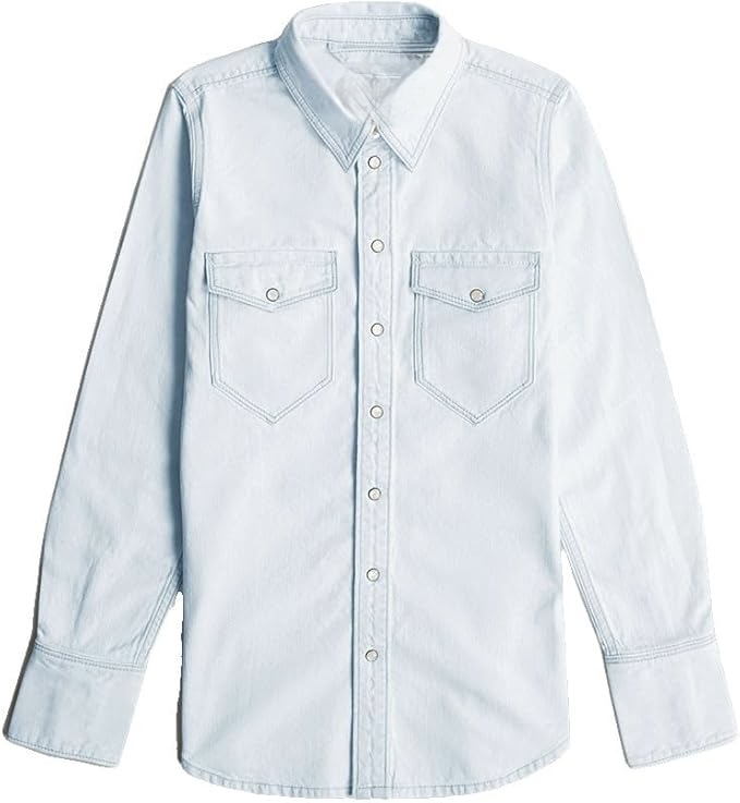 Chemise décontractée en denim bleu, col classique, patte de boutonnage à boutons-pression, manches trois-quarts avec patte de revers, deux poches à rabat, ourlet arrondi