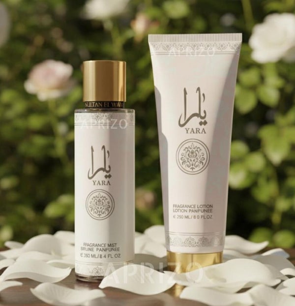 Il s’agit d’un coffret cadeau Sultan El Waha Yara contenant une lotion et une brume parfumées.
