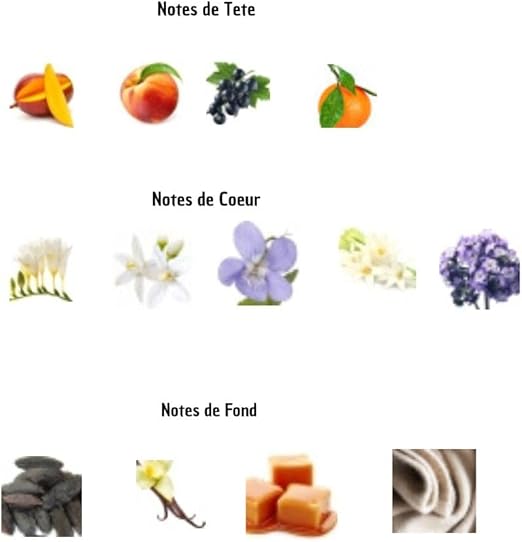 - Notes olfactives : mangue, pêche, cassis, mandarine (tête) ; freesia, héliotrope, tubéreuse, fleur d’oranger, violette (cœur) ; caramel, fève tonka, vanille, cashmeran (fond)