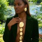 Il s’agit d’un ensemble de bijoux plastron et de boucles d’oreilles assorties allié à texture martelée et de couleur doré