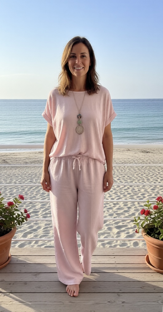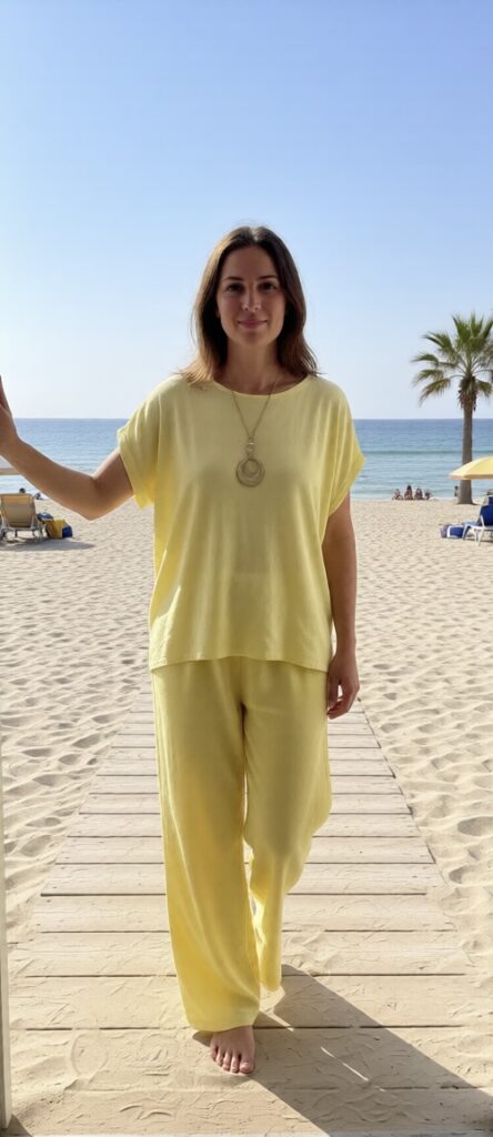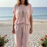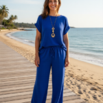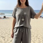 Cet ensemble deux pièces séduit par son style minimaliste et moderne, idéal pour une allure à la fois confortable et élégante. Il se compose d’un haut à manches courtes et à la coupe fluide et d’un pantalon large à taille élastiquée et cordon de serrage, créant une silhouette féminine et décontractée. Son tissu léger et confortable assure un confort optimal tout au long de la journée. Facile à porter ensemble pour un look harmonieux ou séparément avec d’autres vêtements, cet ensemble est un incontournable polyvalent. Disponible dans une variété de couleurs, il s’adapte à tous les goûts et à toutes les occasions.