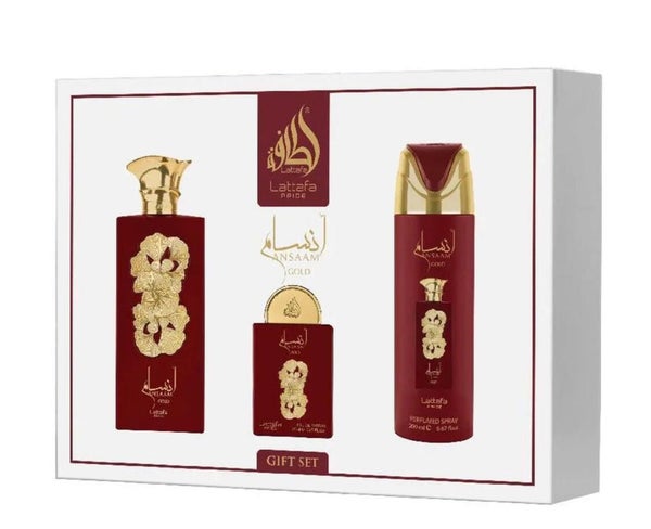 Le coffret cadeau Lattafa Pride Ansaam Gold réunit trois produits parfumés : une eau de parfum de 100 ml, un déodorant spray de 200 ml et une miniature de 20 ml. Lattafa Pride Ansaam Gold offre un mélange harmonieux de notes fruitées, florales et sucrées qui éveillent les sens. Ce coffret est idéal à offrir ou pour un usage quotidien, vous permettant de profiter d’un parfum élégant à tout moment.