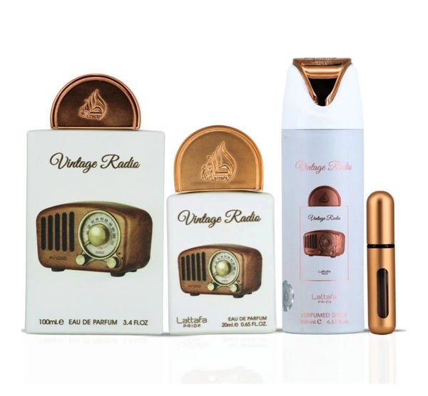 Ils’agit d’un coffret cadeau Lattafa Pride Vintage Radio, un parfum unisexe oriental et boisé.