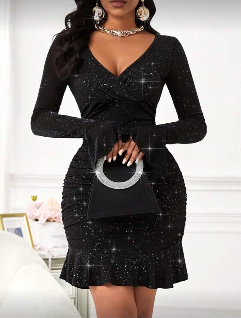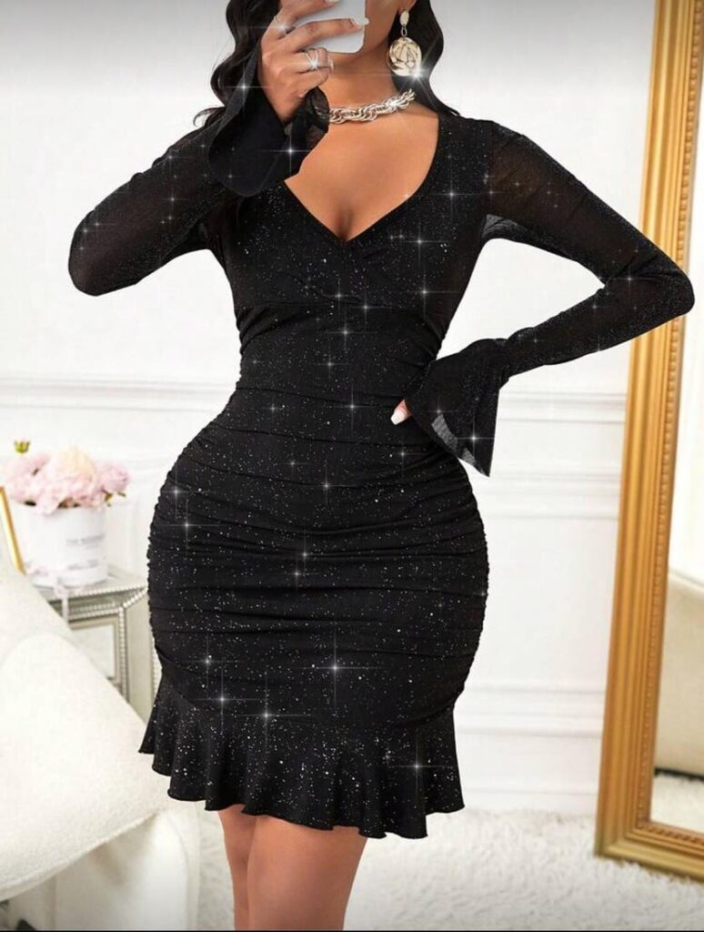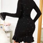 Robe mini moulante à manches longues et col en V pour femme VKIHOC, ornée de sequins et de volants. Idéale pour les soirées cocktail. élastique