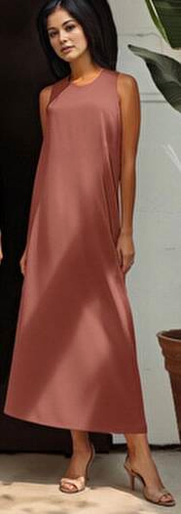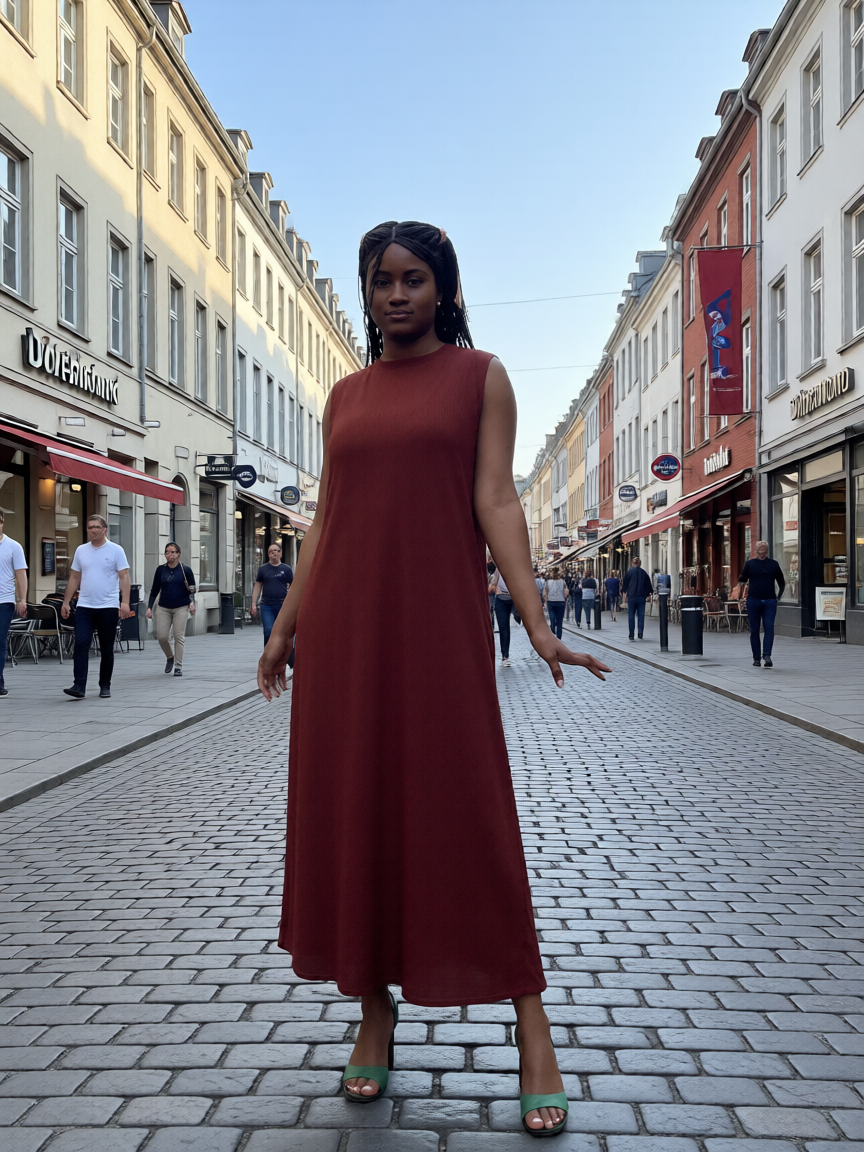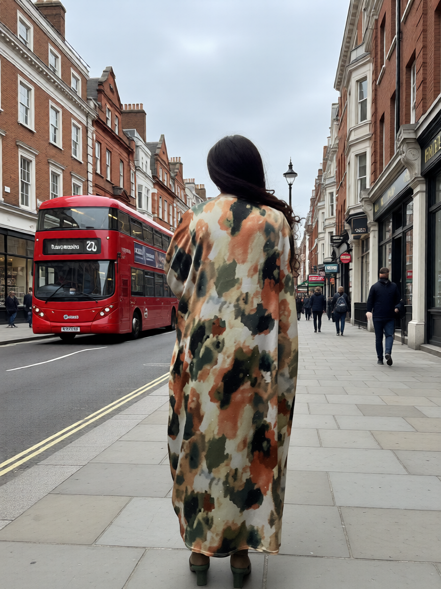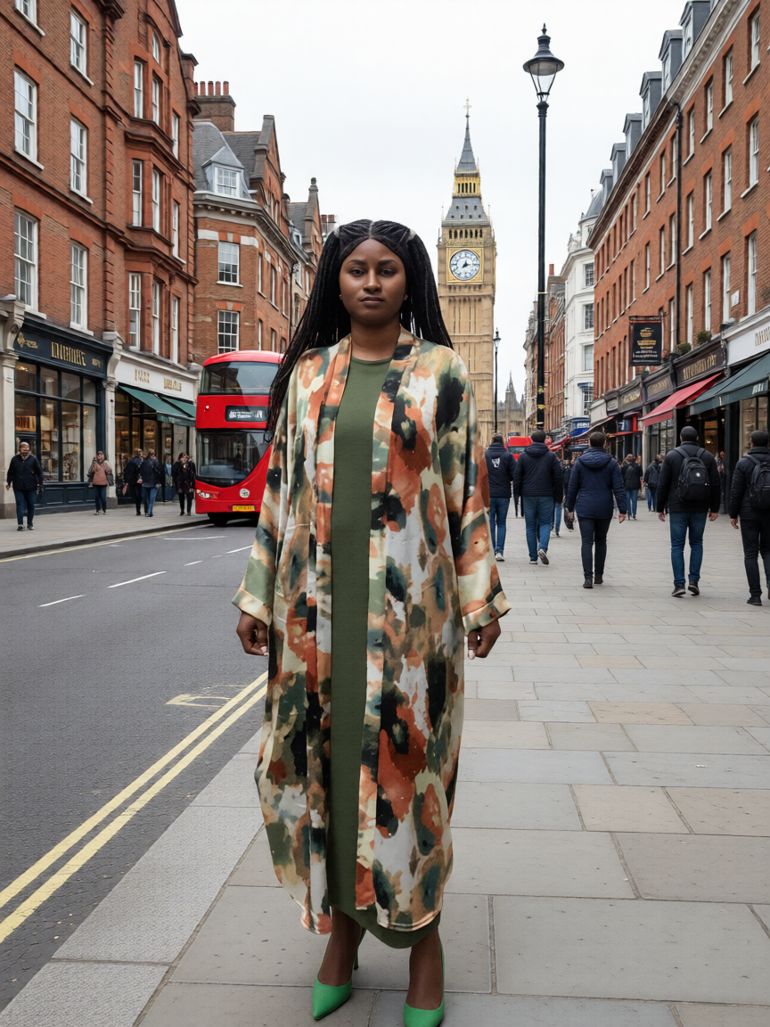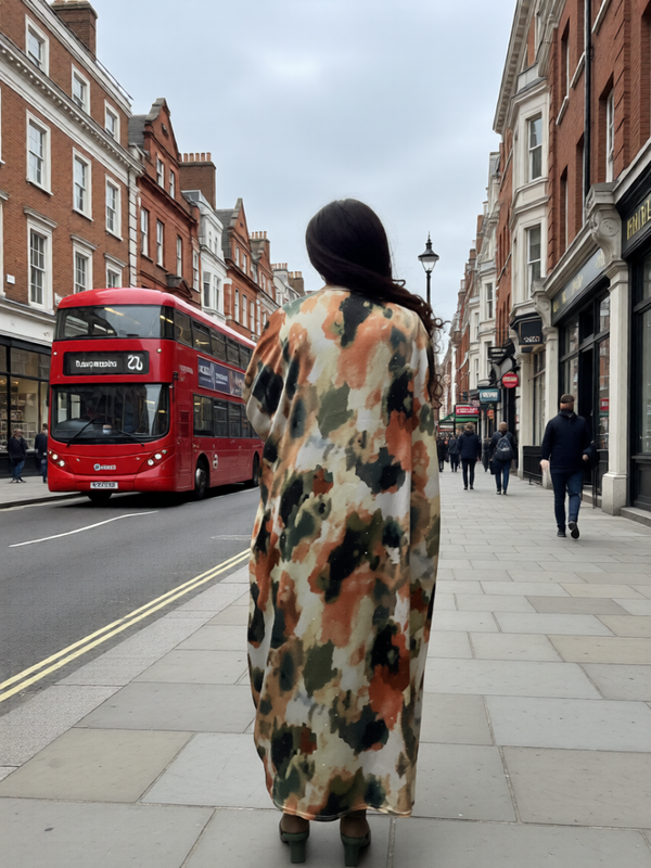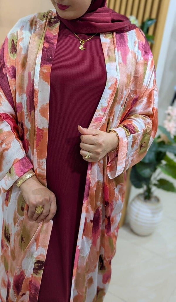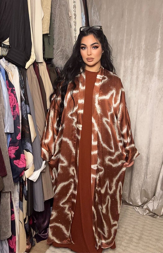 Cette femme porte un ensemble composé d'une robe unie et d'un long kimono à motif tie-dye terracotta, similaire à l'ensemble
